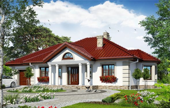 A classic house with the character of a small manor house, the style of which is emphasized by the wide front of the house with a centrally located entrance with a columned porch. The living area is a spacious and bright living room and a dining room located in a glass bay.