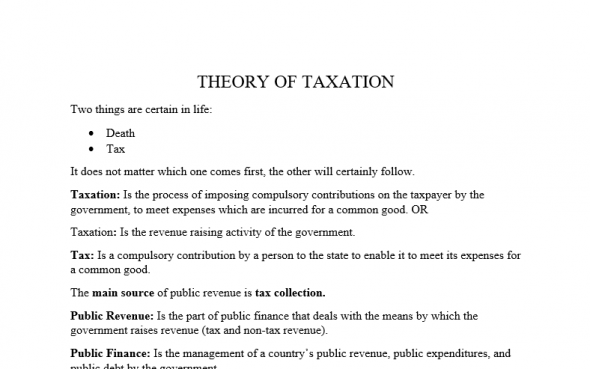 Theory of taxation notes of introduction to taxation unit.The notes contain all the main concepts of taxation as part and source of public revenue.