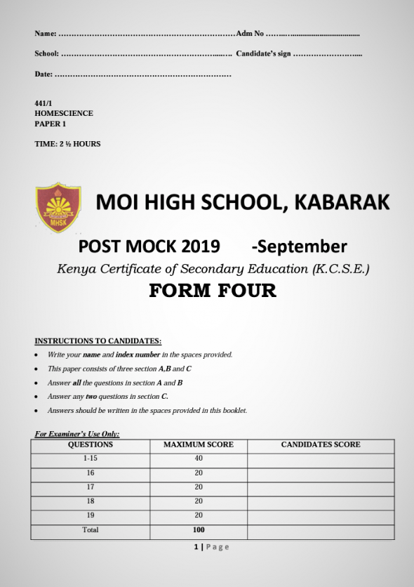 Moi High School Kabarak September 2019 Post-Mock Examination,