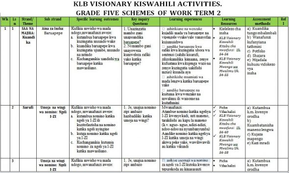 KLB Visionary Grade 5 Kiswahili Activities Schemes of Work Term 2